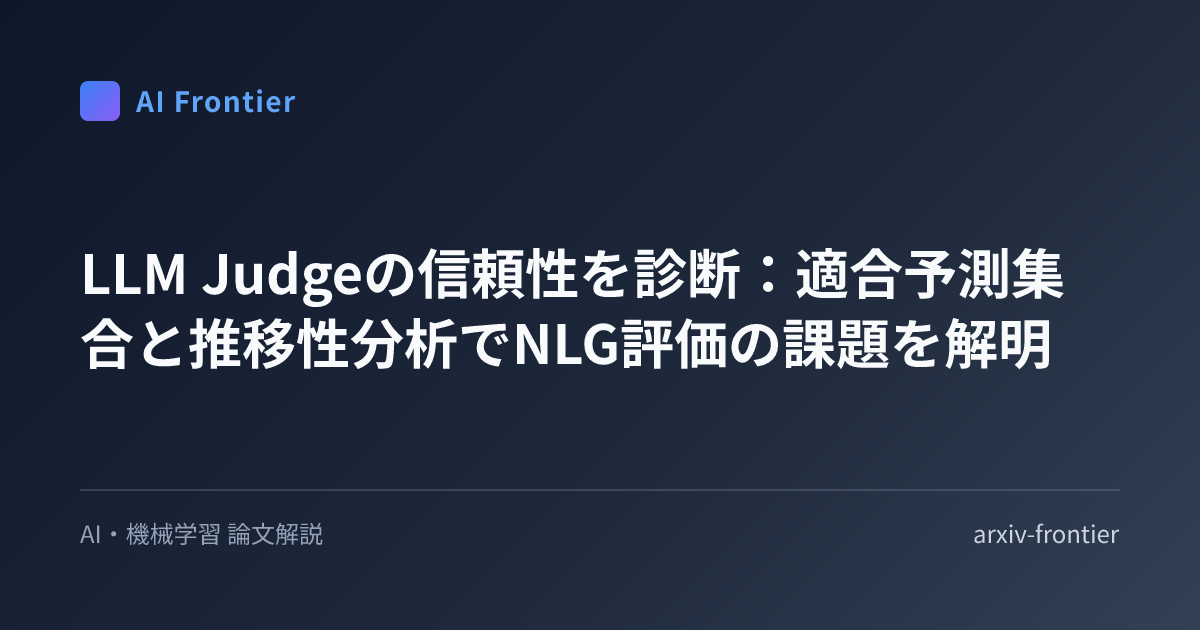 本稿では、LLM JudgeがNLG評価に広く使われる中で、その個々の評価信頼性がいまだ不明確であるという課題に対し、革新的な診断ツールキットを提案した研究を紹介しました。このツールキットは、LLM Judgeの評価における「推移性違反」という矛盾と、「適合予測集合」に基づく評価の不確実性を明らかにします。